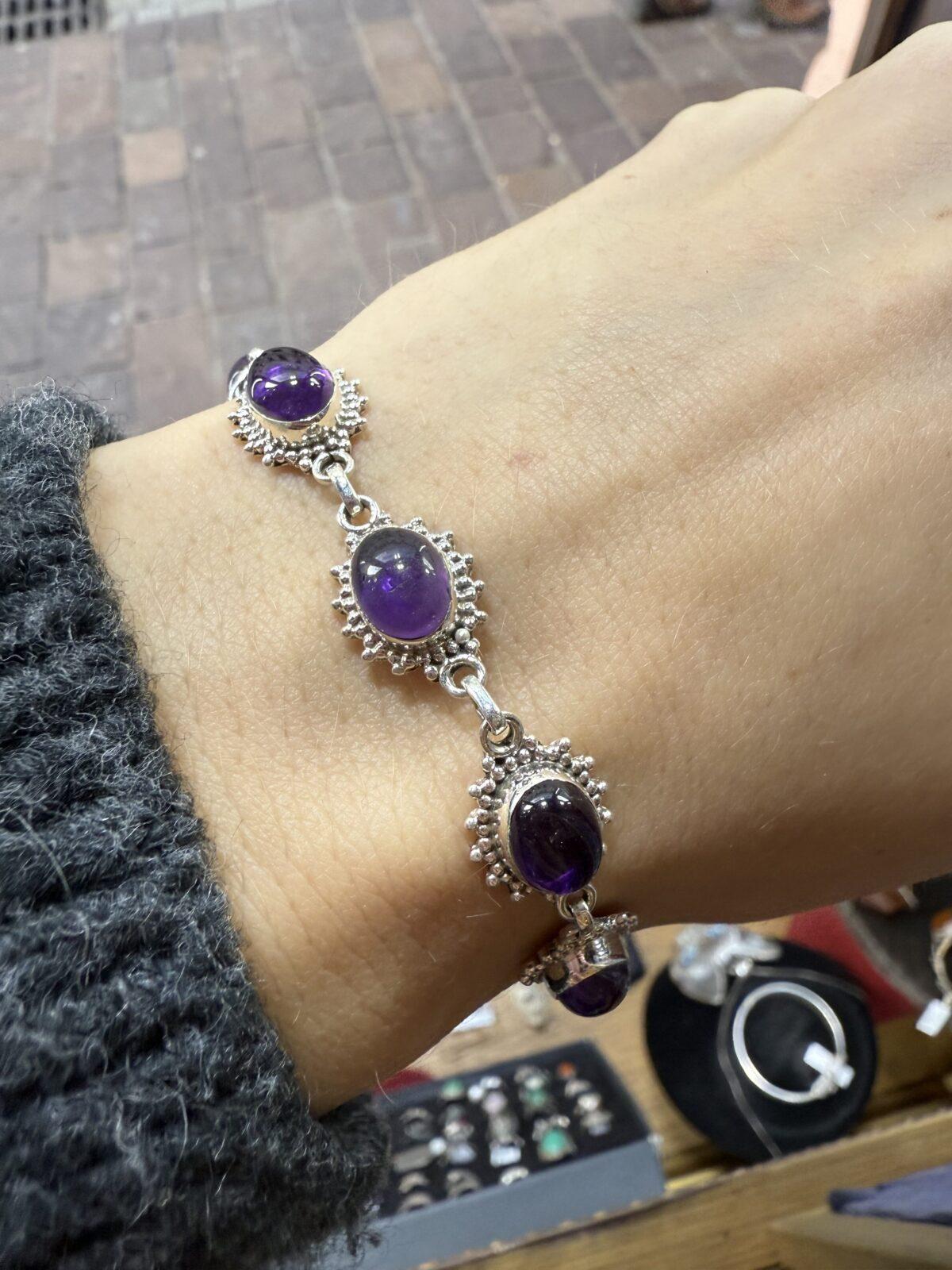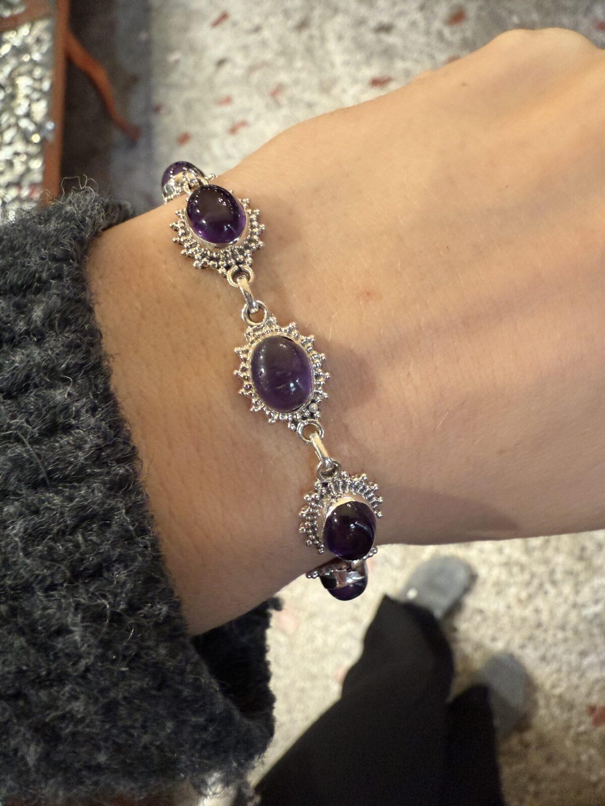 Srebrna bransoletka z ametystami, które mają ciekawą, dziewczęcą oprawę.