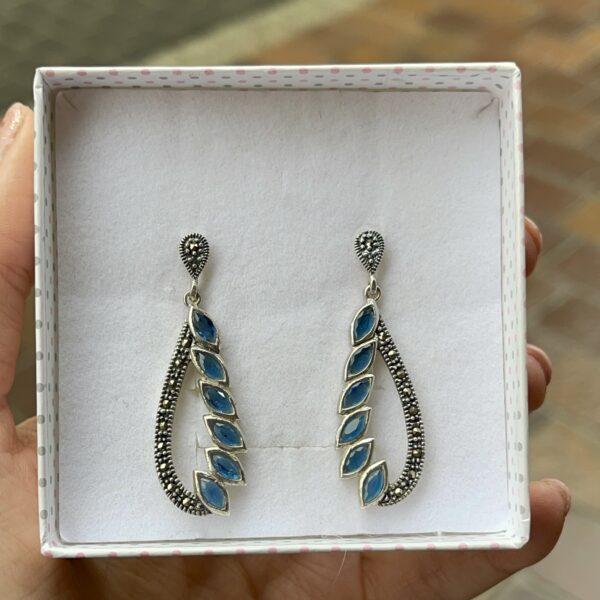 Srebrne kolczyki z świetlistymi, pomarańczowymi kamieniami i ozdobną oprawą.