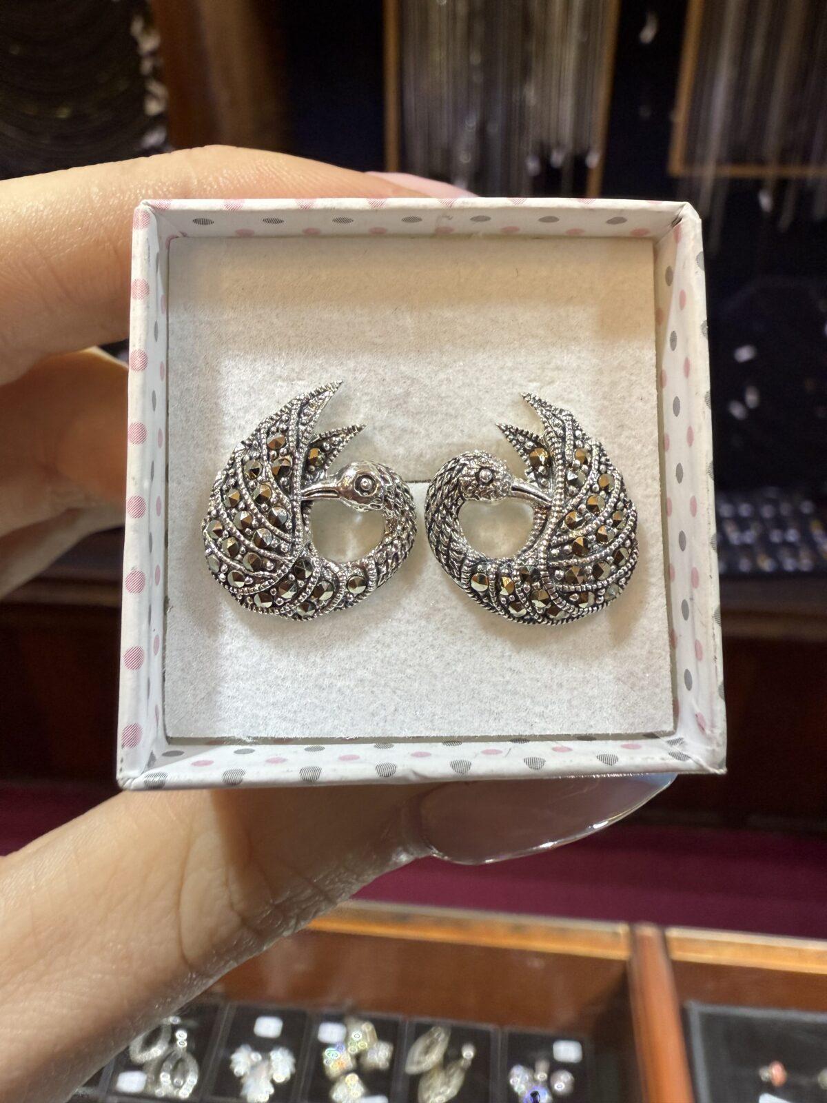 Srebrne kolczyki łabędzie z efektownymi detalami, pięknie prezentują się do upiętych włosów.