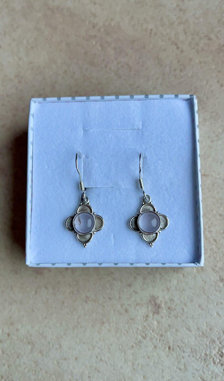 Srebrne delikatne kolczyki z kwarcem różowym, który sprzyja miłości.