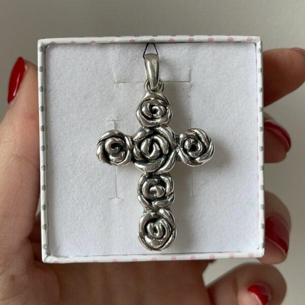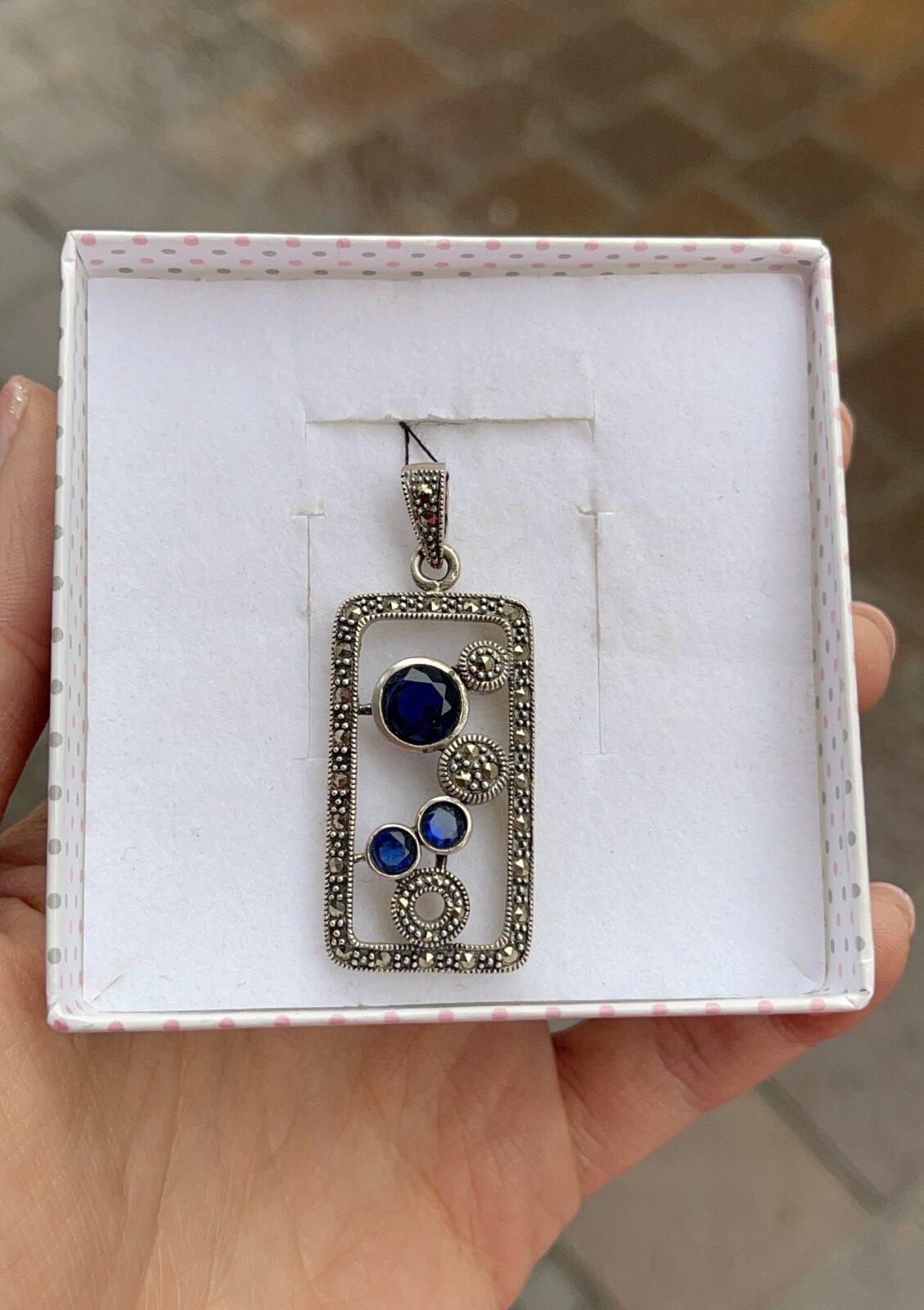 Srebrny (próba 925) wisior o wymiarach 5 x 2 cm z szafirami syntetycznymi i markazytami.
